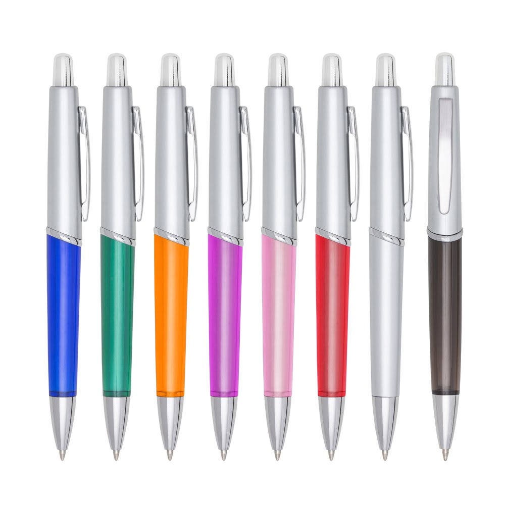 Caneta plástica prata com detalhes coloridos translúcidos. Clip de metal, aciona por clique.